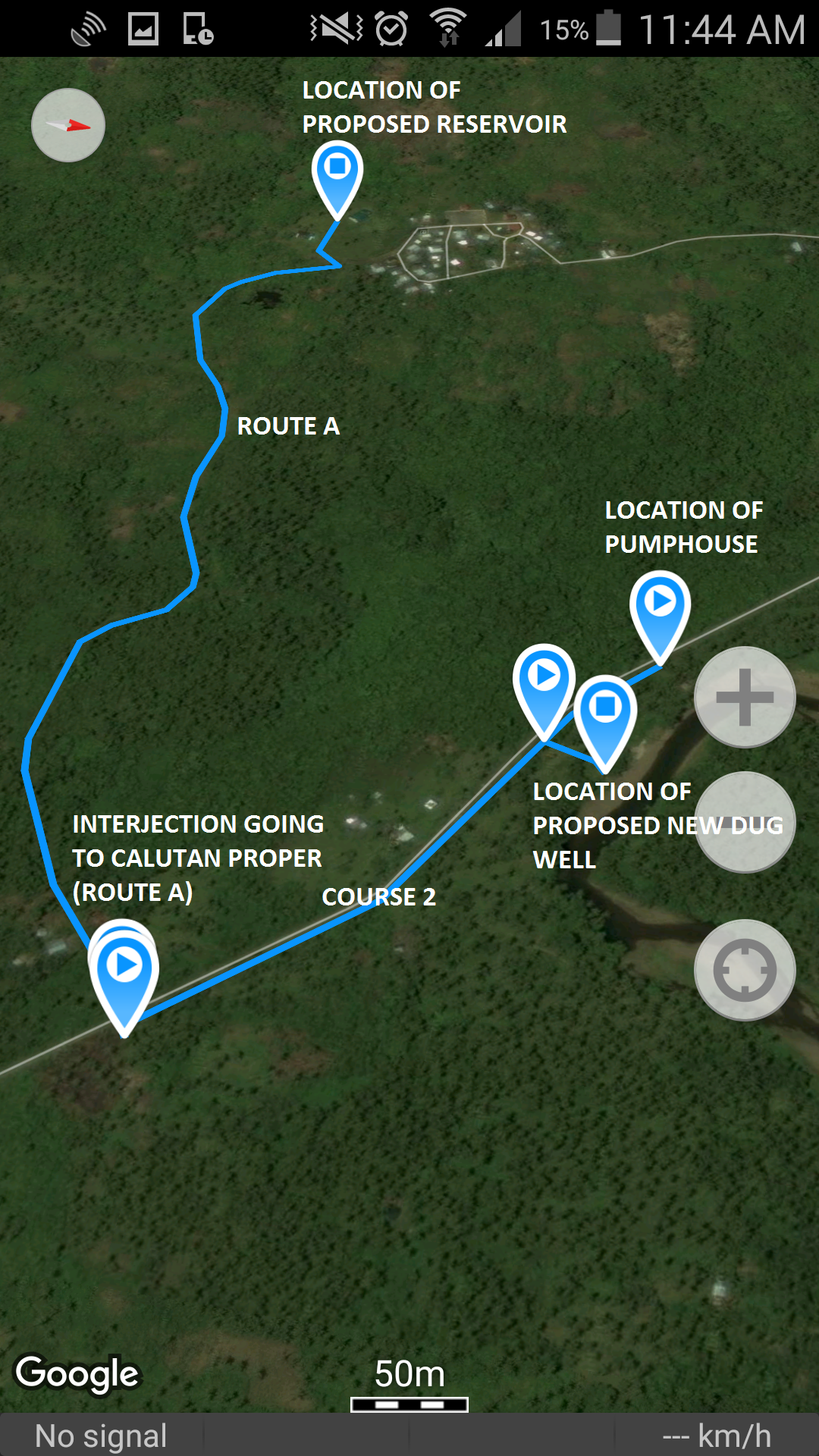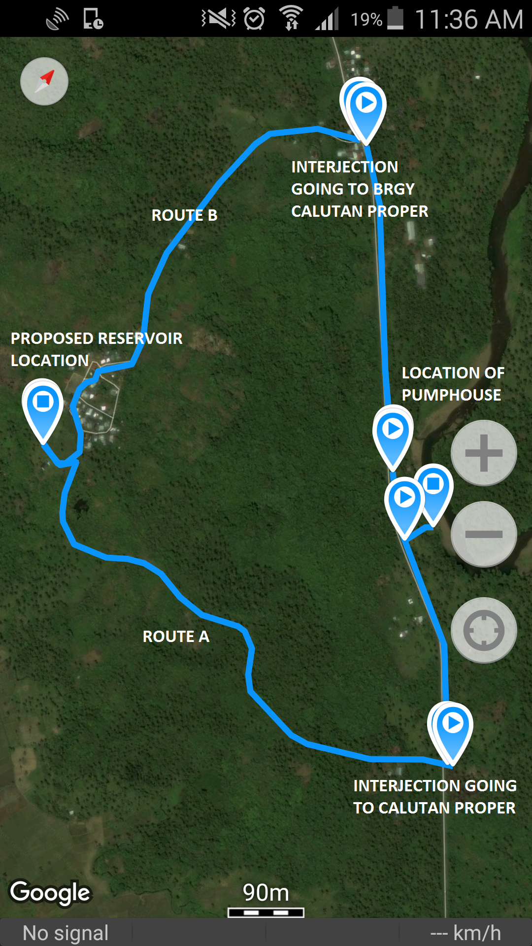 The Water Distict introduces 2 routes for the pipe laying from the reservoir to the pipe connections. Route A is easier for pipe laying since the water district had already pipes overlayed from the Pumphouse to Point A (course 2) (Interjection to Calutan Proper) but regarding to conversation to the lot owners of the properties that will be hit of the activity will be another problem since the water district assumes that these lot owners will not allow pipe laying without compensation. And, it will take time to talk and having an agreement to these lot owners.